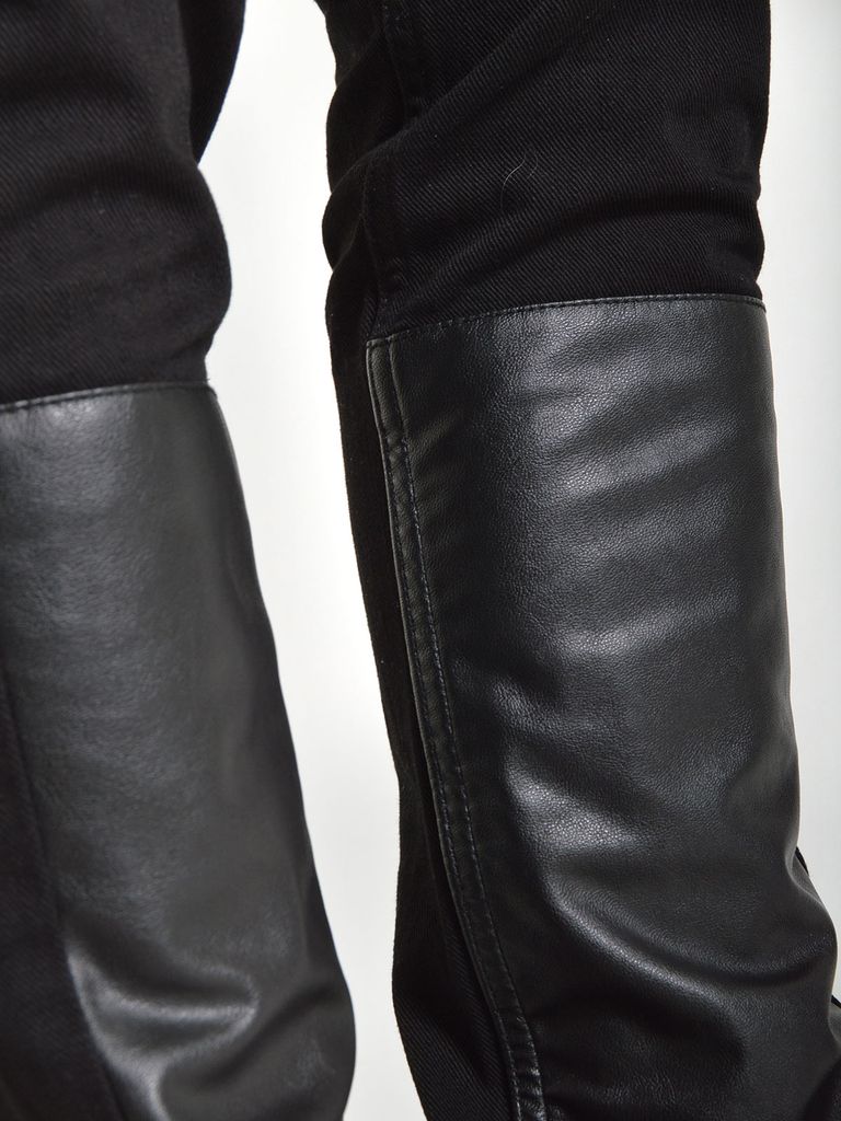 Svarta jeans från Red Collar Project. Med raka och smala ben utan att vara tajta. Utan stretch så du kan själv jobba in din egen passform på dem. Med konstskinn på smalbenen (se närbild). (På bild 187cm/87kg och strl 32)