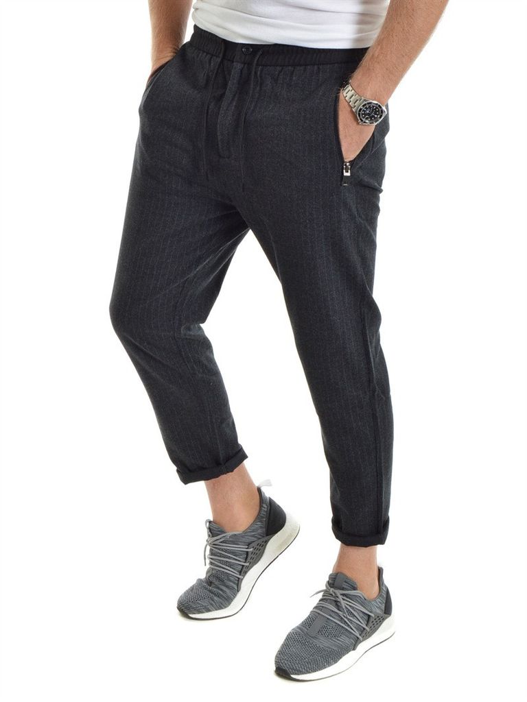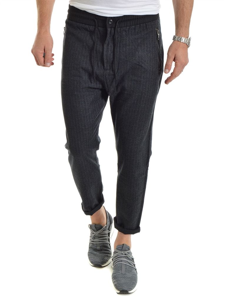 Hybridbyxa från Gianni. Resår och snöre i midjan, zipperfickor för händerna. Kritstrecksrandiga ben i finbyxematerial. Normala i storleken. (På Bild, 187cm/86kg strl.32)