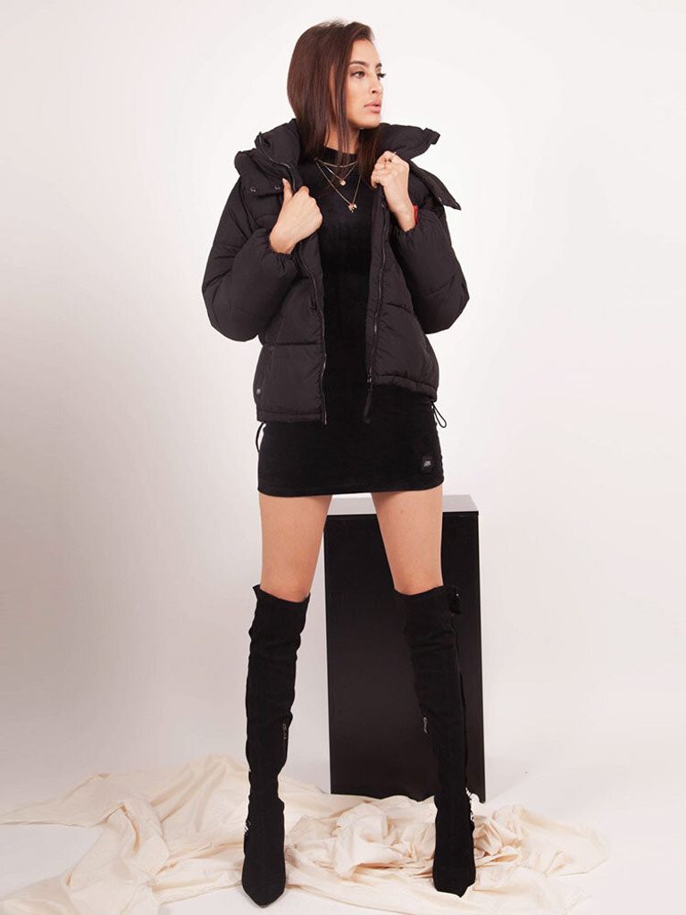 Svart damjacka från franska Sixth June. En kort puffermodell med luva. Zipperficka på bröstet och ena ärmen. Fickor för händerna. Dragsko nedtill.